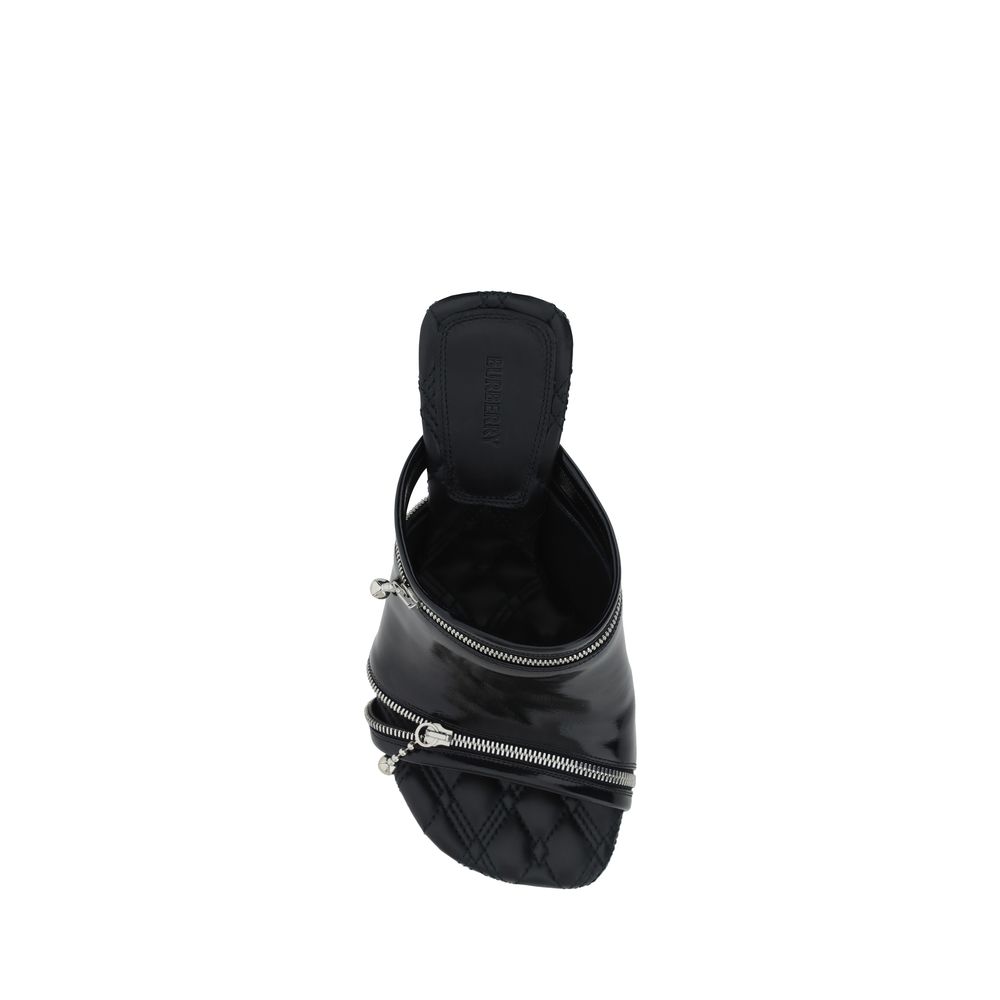 Sandalias de piel de becerro de Burberry con un diseño de piel brillante, tacón de aguja, plantilla de piel acolchada, puntera cuadrada, banda ancha con cierre de cremallera aplicado en la parte delantera y suela con el icónico logo de Equestrian Knight estampado.