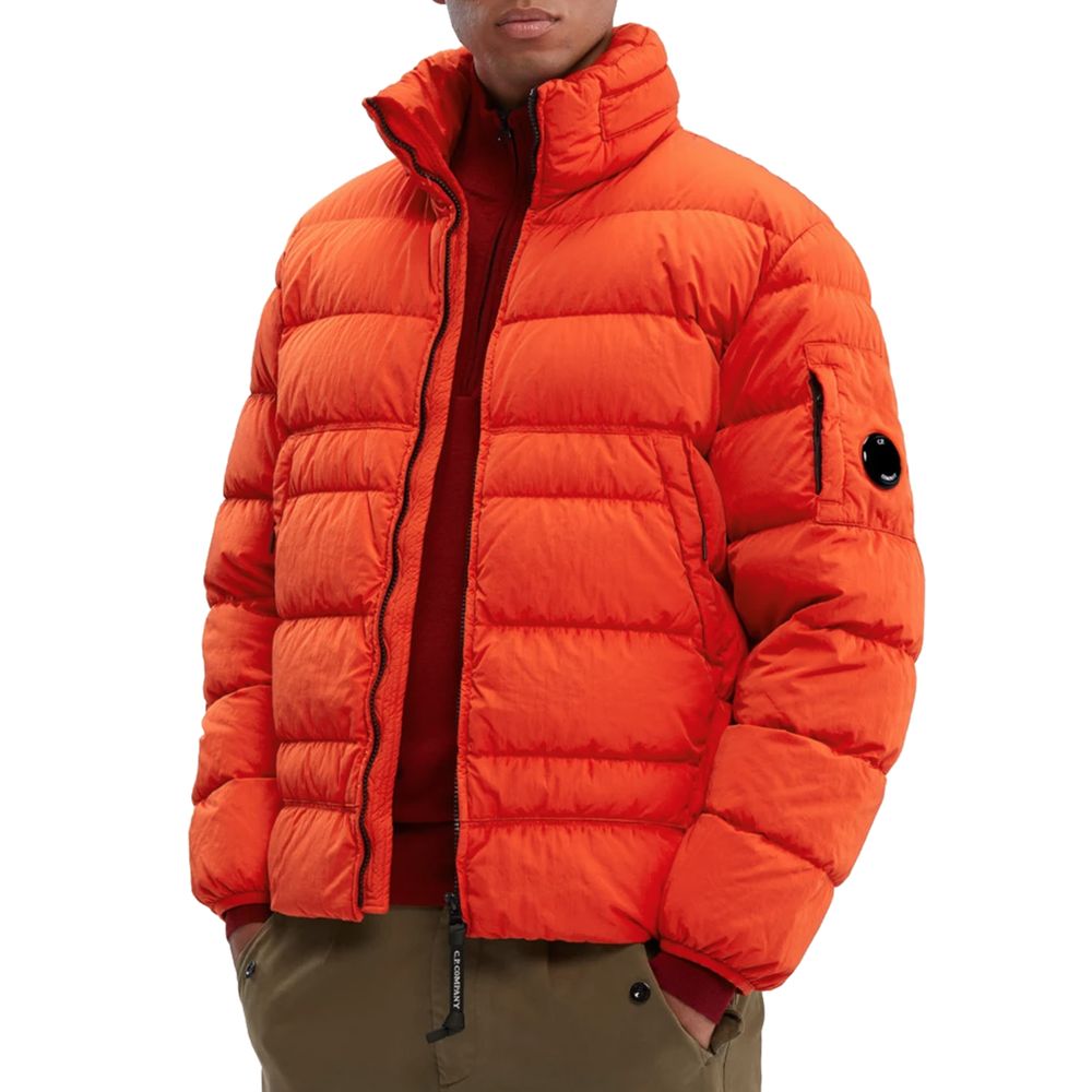 Chaqueta corta de plumón de nailon de CP Company, logotipo de plástico negro en el hombro, capucha oculta en el cuello, cierre de cremallera y dos bolsillos laterales, uno interior.