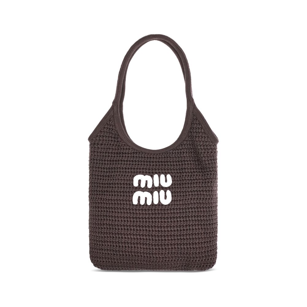 Bolso de hombro Miu Miu, confeccionado en algodón con un delicado patrón de crochet calado. El modelo cuenta con doble asa superior y luce el icónico monograma Miu Miu bordado en contraste en la parte delantera. El interior, con un solo compartimento, incluye una práctica bolsa extraíble a juego. Un accesorio artesanal y femenino, perfecto para completar looks de verano con un toque de elegancia informal.