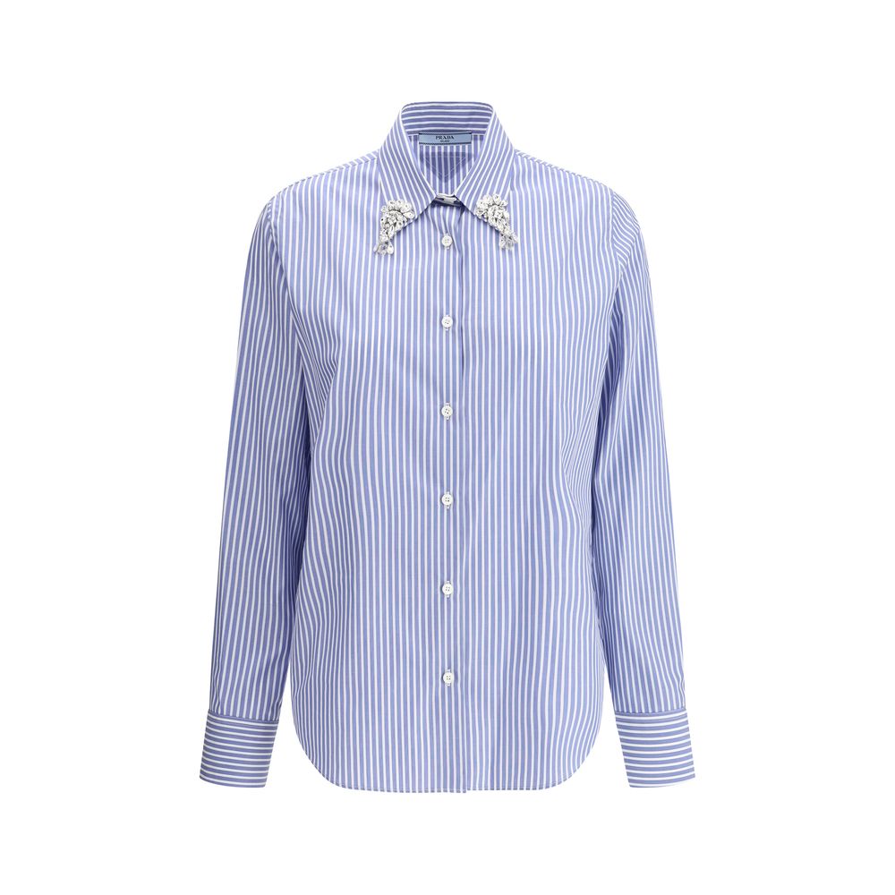 Camisa de algodón de Prada, cuello clásico con detalle de joya brillante aplicada, cierre con botones en la parte delantera, puños con botones ajustables, patrón de rayas de dos tonos, corte regular.
