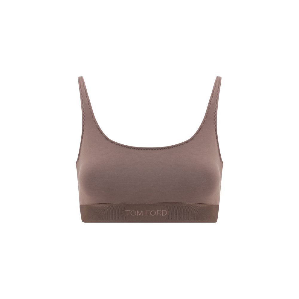 The modal bralette Top with jacquard logo is an essential garment with a minimal and sporty design. It features a round neckline at the front, thin straps and a U-neck at the back that enhance the feminine silhouette. The elasticated bottom band provides comfort and support, while the jacquard logo on the front adds a distinctive touch. The fit is short and fitted, perfect for wearing on its own or as a base under other garments.